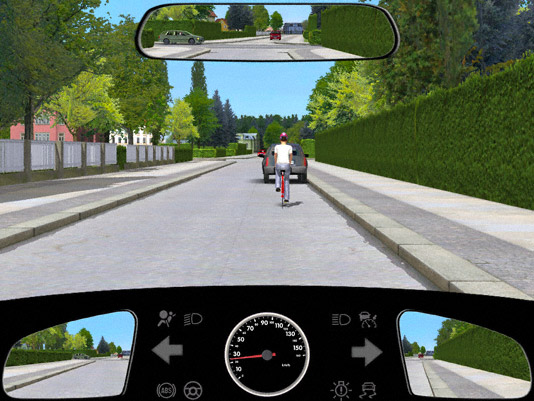 Die Radfahrerin wird links an dem parkenden Pkw vorbeifahren